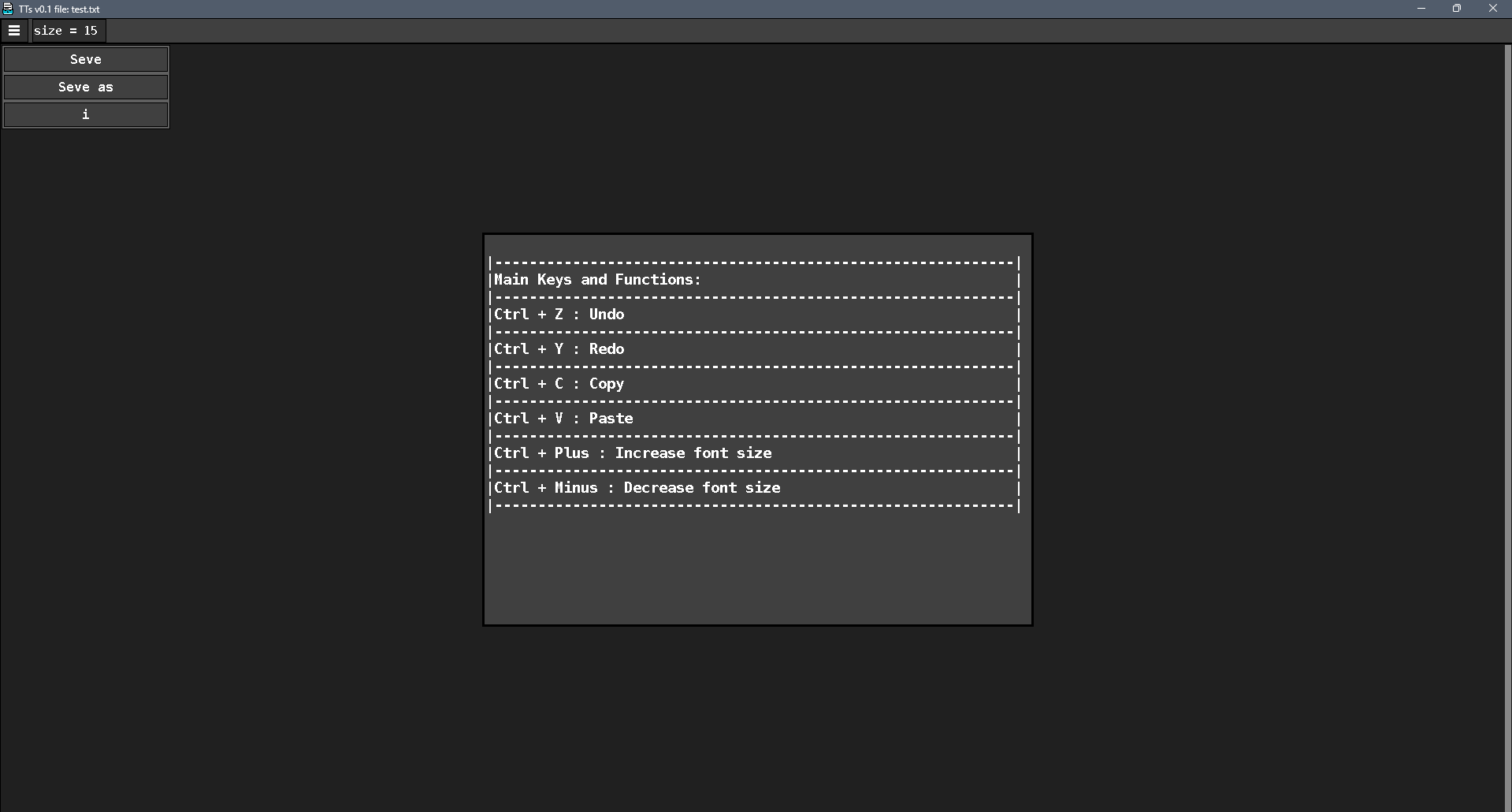 TTs v0.1 is a lightweight and user-friendly text editor for modern Windows. The program can open and save different text file formats, supports Undo/Redo, copy, paste, and font adjustments. Its interface is clean, intuitive, and easy to use.